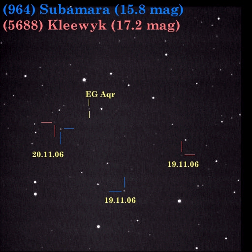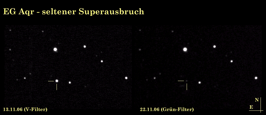 Bei EG Aqr handelt es sich um einen Stern der Klasse UGSU (SU UMa) mit einer maximalen Helligkeit von 12.5 mag im Superausbruch und einer Minimalhelligkeit von 18.5 mag. Die Designation des Sterns lautet 2320-08. Am 8. November 2005 zeigte der Stern seinen dritten bisher beobachteten Ausbruch nach Oktober/November 1958 und August 1959. In beiden Jahren wurde eine Maximalhelligkeit von 14.0 mag gemessen. Beim aktuellen Ausbruch konnte eine Superbuckelperiode von 0.07979(4) Tagen bestimmt werden. AnimationDie folgenden Montagen und Animationen wurden während des Ausbruchs im November 2006 von Hans-Günter Diederich aufgenommen und angefertigt.