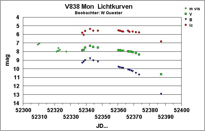 Wolfgang Quester verfolgte die Helligkeit von V838 Mon in verschiedenen Farbfiltern mit einer CCD-Kamera. Die Farbfilter bedeuten V = CCD-visuell, B = blau und Ic = Infrarot. Der abgebildete Zeitbereich liegt zwischen dem 25.Januar (JD 2452300) und dem 5.Mai 2002 (JD 2452400).