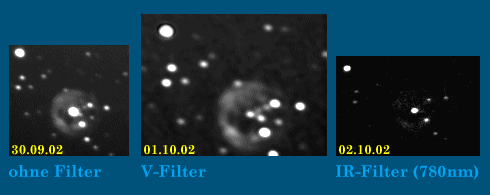 Die folgende Zusammenstellung von Aufnahmen des BAV Mitglieds Hans-Günter Diederich zeigt das unterschiedliche Aussehen des Nebels in verschiedenen Filtern: