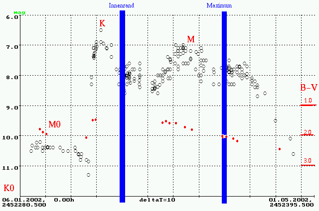 Die folgende Lichtkurve gibt die Beobachtungen von BAV Mitgliedern wieder zwischen Entdeckung des Helligkeitsausbruchs sowie dem Verschwinden des Sterns hinter der Sonne. Mit den vertikalen Linien sind der Zeitpunkt der Entdeckung der Ringstrukturen bzw. des Lichtechos (''Innenrand'') sowie der Zeitpunkt der maximalen Ringhelligkeit markiert. Über den Helligkeitspunkten steht das zu der entsprechenden Zeit gemessene Spektrum. Außerdem ist die Differenz zwischen den blauen und den visuellen Lichtanteilen (B-V) aufgetragen (gefüllte Kreise). Aus der BAV beobachteten die folgenden Mitglieder: P.Enskonatus (16), J.Gensler (4), A.Holbe (19), P.Hoffmann (14), A.Kammerer (16), T.Lange (42), A.Krawitz (30), G.Krisch (20), W.Kriebel (23), H.Marx (11), W.Quester (15), D.Süssmann (32), F.Vohla (26).