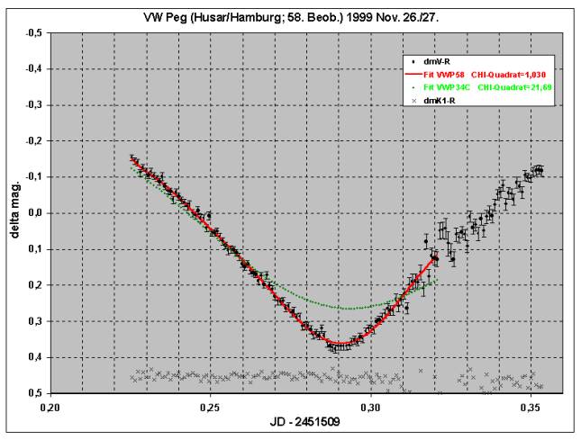 Die kürzlich erschienene Veröffentlichung über VW Pegasi im IBVS 4916 [1] wird als BAV Mitteilung Nr. 129 zusammen mit dem BAV Rundbrief 4/2000 verteilt. Wie schon im Vortrag soll im Folgenden insbesondere über die spezielle Auswertemethodik berichtet werden, welche nicht ohne weiteres aus der Veröffentlichung zu ersehen ist. Im Verlauf dieses Artikels wird mehrfach auf die Abbildungen und Tabellen der IBVS-Veröffentlichung verwiesen. Anders als im Vortrag müssen an dieser Stelle aus Platzgründen alle Ausführungen über Hilfsmittel zur Beobachtungsplanung, zur Leistungsfähigkeit der heutigen CCD-Technologie und über CCD-Beobachtungstechniken bei widrigen Beobachtungsbedingungen, sowie über das Vorgehen bei Literaturrecherchen im Internet entfallen.