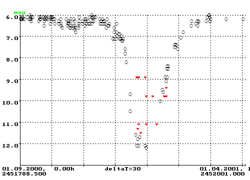 R CrB begann in der zweiten November-Hälfte mit einem Helligkeitsabfall und verlor Anfang Dezember innerhalb von zehn Tagen fünf Helligkeitsklassen (Abb. 3). Ende Dezember trat mit 12.5mag das Minimum ein, Mitte Februar wurde die Normalhelligkeit wieder erreicht.