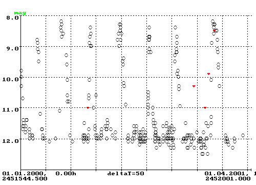 Bei der weiteren Pflege der Datenbankmöchte ich insbesondere auf die zeitraubende Eingabe der monatlichen Beobachtungsberichte weitgehend verzichten. Daher bitte ich alle BAV Mitglieder, die ihre Schätzungen am PC eingeben und sogar per Mail an die AAVSO und AFOEV schicken, mir diese Monatslisten ebenfalls (per Mail oder Diskette) zukommen zu lassen. Diese Schätzungen kann ich dann automatisch in die Datenbank integrieren. Bei allen auf herkömmliche Art erstellten Beobachtungslisten muß ich auf die manuelle Eingabe durch die AFOEV warten, bis die Daten schließlich auf ihrer Homepage zur allgemeinen Verfügung stehen.
