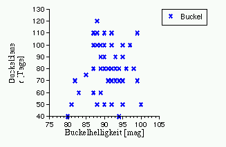 Eine Auswertung der Buckelhelligkeiten und der -längen ergibt die in Abb. 2 dargestellte Verteilung. Bei einer durchschnittlichen Länge von 79.7 Tagen bewegen sich die Werte in einem Bereich von 40 bis 120 Tagen. Die Buckelhelligkeiten liegen zwischen 8.0 und 10.0mag bei einem Mittelwert von 9.2mag. Die Buckel selbst treten damit ausschließlich im zweiten Teil der Anstiegsphase des Sterns auf, während in der Nähe des Minimums keine Buckel zu erkennen sind. Eine Abhängigkeit von Helligkeit und Länge der Buckel existiert ebenso wenig wie eine Periode in der zeitlichen Änderung der Buckellängen.