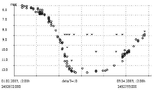 Im vorletzten Rundbrief [3] berichtete ich von einem seltenen Helligkeitsanstieg dieses symbiotischen Sterns. Die Helligkeit blieb von Mitte August 2002 bis Anfang Februar 2003 ungefähr konstant bei 9.6 mag und fällt seitdem langsam ab.
